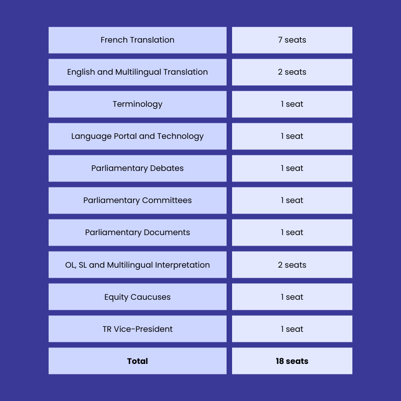 The TR bargaining team will consist of 18 members and will be elected based on where they work at the Translation Bureau:
