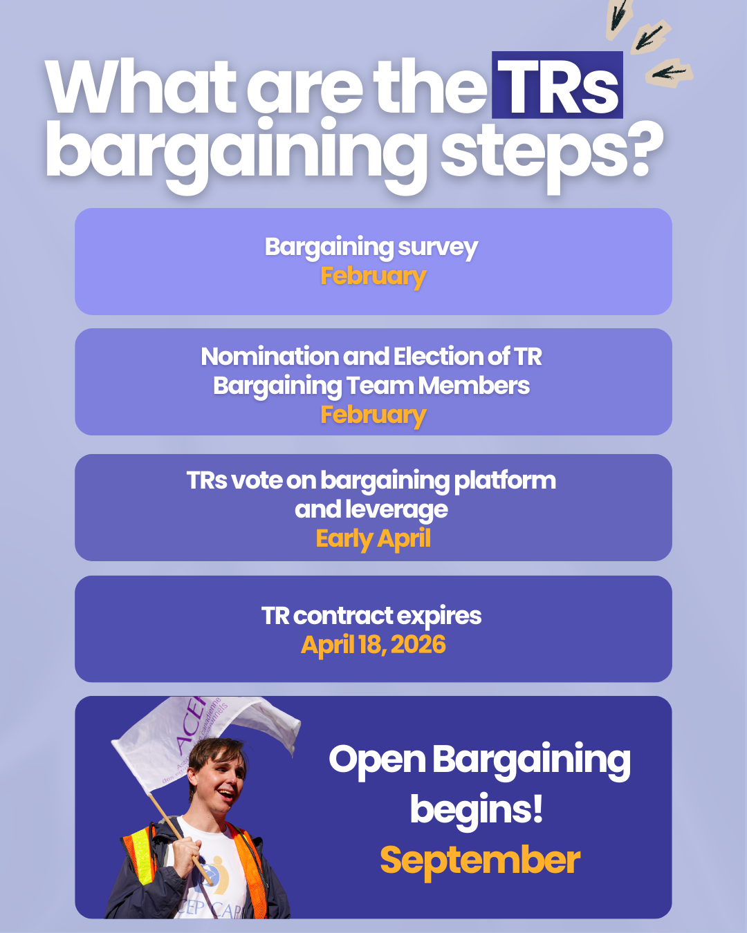 Any member in good standing can run for election. Elected members of the bargaining committee will receive union leave to allow for their participation. The deadline for nominations for ECs is March 8th; for TRs it is February 15th.