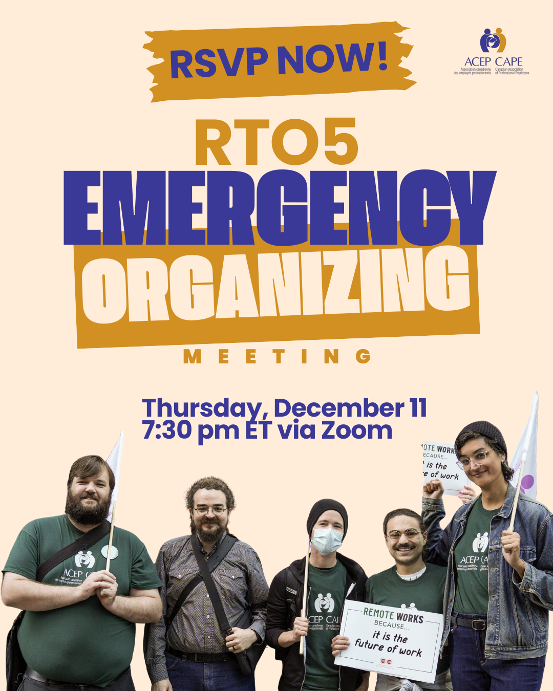 Join your coworkers on Thursday, December 11 at 7:30 pm ET over Zoom for a National Emergency Organizing meeting hosted by departmental organizing committees to learn about the response to RTO4/5 and what you can do to win telework in your next contract.